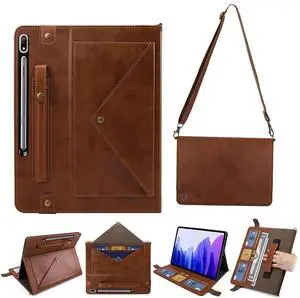 Tablet Carrying Shoulder Bag Case for Samsung Galaxy Tab S9 FE/S9/S8/S7 11", Retro PU Leather Hand Strap Crossbody Shoulder Strap Cards Holder Pocket S Pen Holder Stand Protective Case,Coffee