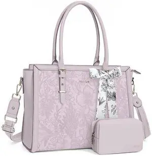 MOSISO Laptop Bag for Women, 17-17.3 inch PU Leather Tote Bag Compatible with MacBook, HP, Dell, Asus Notebook, Front Embossed Retro Hibiscus Computer Bags with Silk Scarf&Clutch Purse, Dusty Lilac