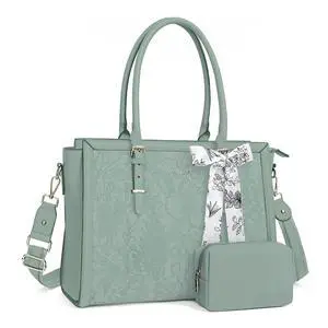 MOSISO Laptop Bag for Women, 17-17.3 inch PU Leather Tote Bag Compatible with MacBook, HP, Dell, Asus Notebook, Front Embossed Retro Hibiscus Computer Bags with Silk Scarf&Clutch Purse, Antique Green