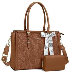 MOSISO Laptop Bag for Women, 15.6-16 inch PU Leather Tote Bag Compatible with MacBook, HP, Dell, Asus Notebook, Front Embossed Retro Hibiscus Computer Bags with Silk Scarf&Clutch Purse, Brown