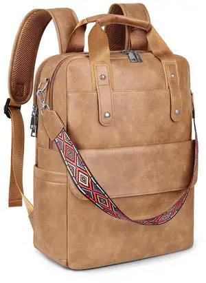 SYTRAH Leather Laptop Backpack 15.6 Inch Womens Laptop Bag, 3 IN 1 Computer Bag Handbag with Colorful Shoulder Bag Strap for Work Travel College Beige Brown