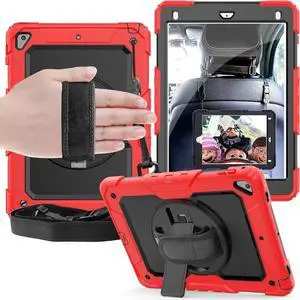 iPad 8th / 7th Generation Case Three Layer Drop Protection Cover with [360 Rotating Stand] Hand Strap & [Stylus Pencil Holder] for New iPad 8 Generation 2020 / iPad 7 Generation 10.2 inch 2019 Red