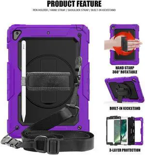 New iPad 10.2 Case 2019 iPad 7th Generation Case Cover with Pencil Holder / Rotatable Stand / Hand Strap and Shoulder Belt Shockproof Case for iPad 10.2 inch 2019 Tablet A2197 A2198 A2200 Purple