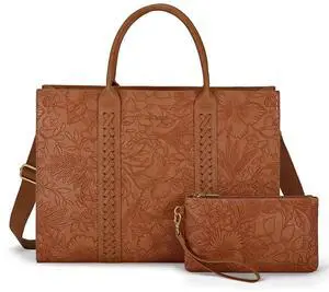 LOVEVOOK Laptop Tote Bag for Women, Vintage Leather Work Bags, 15.6 Inch Laptop Bag With Cup Holder, Waterproof Computer Purse, Professional Briefcase Office Shoulder Handbag, Yellow Brown Embroidery