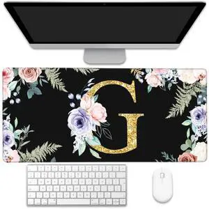 KOAIWPAE Desk Mat, Flower Golden Letters G Extended Gaming Mouse Pad Large, 35.4"x15.7" Big Mouse Pad with Non-Slip Base and Stitched Edge, Long Computer Keyboard Mouse Mat for Home Office Work
