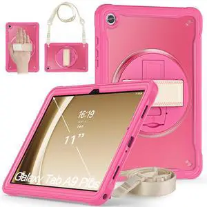 Junfire Clear Case for Galaxy Tab A9 Plus 11-inch 2023, Rugged Shockproof Slim Hard Samsung A9+ Case with 360Rotating Kickstand/Hand Strap/Shoulder Strap-Rose