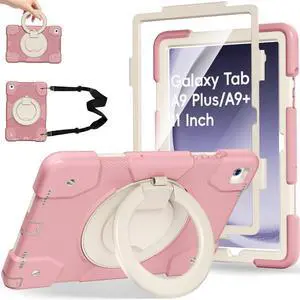 Andnary Case for Samsung Galaxy Tab A9+, Heavy Duty Shockproof Cover with Pencil Holder/360 Rotating Handheld Stand/Shoulder Strap, A9 Plus Case 11 Inch 2023 for SM-X210/X216/X218, Pink