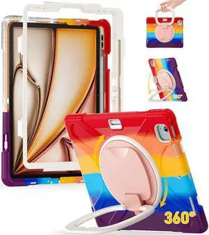 for iPad Air 13 Case M3 2025/ M2 2024, iPad Pro 12.9 (6th/5th/4th/3rd Gen), Heavy Duty Shockproof Cover with Pencil Holder, Rotating Handle Grip, Stable Kickstand, Shoulder Strap, Colorful Red