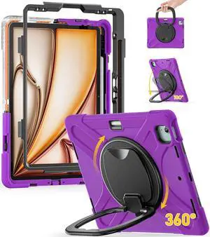 Case for iPad Air 13 Inch M3 2025/ M2 2024 & iPad Pro 12.9 6th/5th/4th/3rd Gen: Military Grade Silicone Protective Cover with Pencil Holder, Kickstand, Swivel Handle, Shoulder Strap, Purple