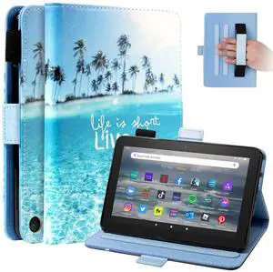 Dteck for All-New Fire 7 Tablet Case (12th Generation, 2022 Release), PU Leather Slim Folding Stand Multiple Viewing Angles Cover with Auto Wake/Sleep for Kindle Fire 7" 12th Gen,Beach Live it