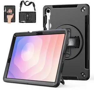Gerutek Case for Samsung Galaxy Tab S10 FE+/ S10 FE Plus 2025 13.1 Inch, Full-Body Drop Protective Case with Screen Protector, Pen Holder, 360 Rotate Hand Strap & Stand,Shoulder Strap, Black