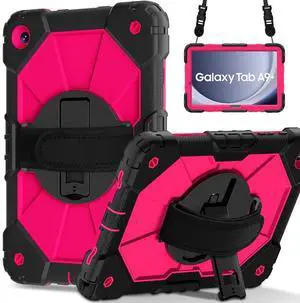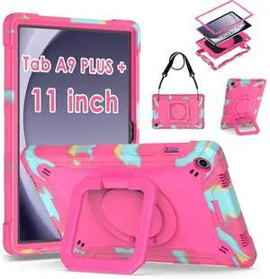 Meifei Case for Samsung Galaxy Tab A9+ 11 Inch 2023 (X210/X216/X218), Heavy Duty Shockproof Rugged 360 Rotating Hand Strap Protective Case for Galaxy Tab A9 Plus Tablet, Black/Rose Red