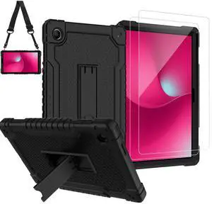 Doemoil case for T-Mobile Revvl Tab 2 2025 Released 10.1 inch with 2 PCS Screen Protector Hybrid Shockproof Protective Case Hard Shell Built in Kickstand Shoulder Strap (Black+2PCS Glass)