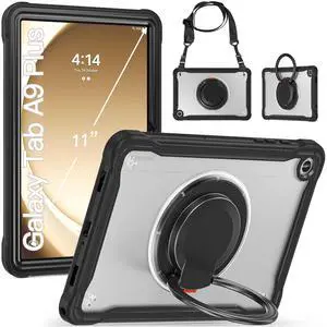 BRAECN Case for Samsung Galaxy Tab A9+ 11 inch (SM-X210/X216/X218) 2023 Shockproof Rugged Protective Cover with Pencil Holder/Rotate Stand/Shoulder Strap for Galaxy Tab A9 Plus, Black Transparent