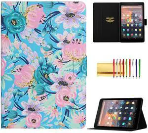 Flower Case for Fire 7 Tablet (2015/2017/2019) 5th/7th/9th Gen, Techcircle Slim Stand Folio Floral Design PU Leather Magnetic Cover Soft Silicone Back Book Case with Card Slots, Pink Blue Flowers