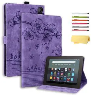 for Kindle Fire HD 8 & Fire HD 8 Plus Case 12th/10th Generation (2024/2022/2020) 8", UUcovers Embossed PU Leather Folio Magneic Cover with Stand/Pencil Holder, Cherry Blossom Purple Cat