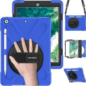 BRAECN for iPad 6th Generation Case 9.7 inch with Pencil Holder, Shockproof Dropproof Protective Rugged Case with Built-in Hand Strap, Kickstand and Detachable Shoulder Strap for iPad 5th Gen-Blue