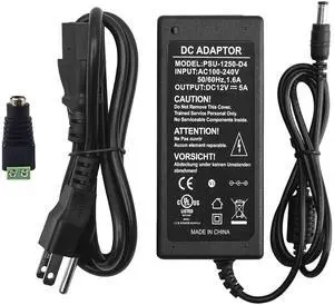 12V 5A Power Supply Adapter, AC 100-240V to DC 12V Transformer, for CCTV Security Surveillance Cameras, Router, LED Strip Light, with Female Plug Connector Terminal, UL-Listed