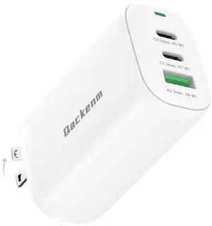 Qackenm 65W USB C Charger Block, 3 Ports GaN USB C Wall Charger, Foldable Fast Charging for MacBook Pro/Air, Dell XPS, iPhone 17/16/15/14/13, iPad Pro/Air, Galaxy S24/S23, Pixel, Steam Deck (White)