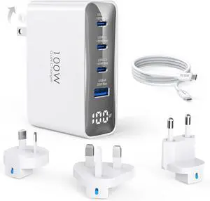 Topadre 100W USB C Travel Charger 4-Ports Foldable Travel Adapter Plug Converter with UK/EU/AU Plugs Fast Charging for Macbook Pro/Air for iPad Pro/iPhone 16/15 Pro Max for 45w Galaxy White
