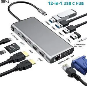 USB C Laptop Vertical Docking Station,12 in 1 Type C Hub Multiport Adapter Dongle with, HDMI, VGA, PD, Ethernet, SD/TF, 4*USB 3.0 Ports, USB-C Data , Mic/Audio, Compatible for Laptops Notebook