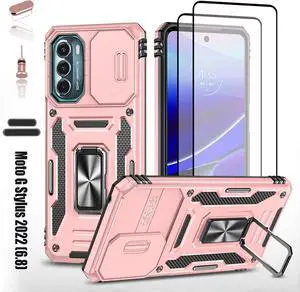 Heavy Duty Case for Motorola Moto G Stylus 2022 Military Grade Dual Layer Hybrid Cushioning Rubber Bumper Protector with Slide Camera Protector Built-in 360 Degree Swivel Stand -Rose Gold