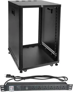 RIVECO POMU 18U Stereo & Server Rack with Caster Wheels, Rolling Network Cabinet, Open Frame Rack +RIVECO PDU 6 Outlets with 2 USB Ports
