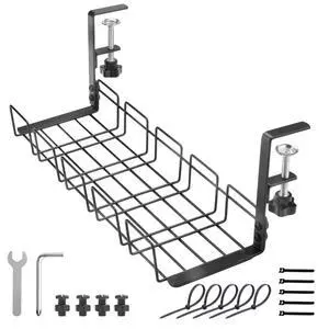 Under Desk Cable Management Tray, 15.7'' Metal Wire Organizer with Clamp, No Drill Desk Cord Rack for Cable Management, Computer Wire Organizer for Office and Home Sturdy & Scratch-Free