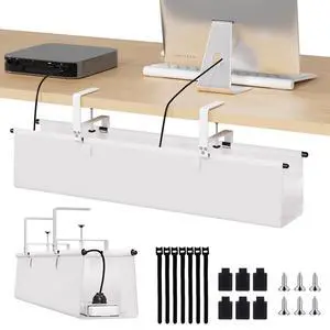 Under Desk Cable Management Tray - 28" Cord Organizer for Desk No Drill, Fabric Under Table Wire Organizer with 16X Cable Ties Hide for Office/Home, Cord Hider Fits Adapters & Sockets, White