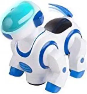 kids tech va90024 interactive robotic dog, bump & go, lights up toy, wagging tail, wiggling head, lights up, sing and dance, wags its tail and wiggles, lights up, white/blue