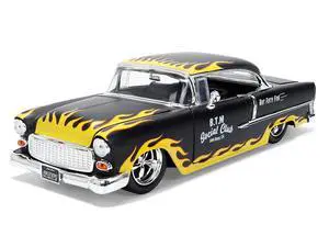 1955 Chevrolet Bel Air "BTM Social Club" Matt Black with Flames "Bigtime Muscle" Series 1/24 Diecast Model Car by Jada