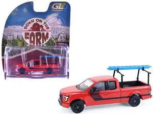 2015 Ford F-150 Pickup Truck with Ladder Rack Red with Black Stripes "Down on the Farm" Series 1/64 Diecast Model by Greenlight