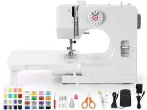 Sewing Machine for Beginners [Full Set] with Finger Guard and Fabric Bundles - Mini Sewing Machine with Sewing Kits, Foot Pedal, US Adapter and Extension Table