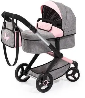: Pram Xeo: Butterfly Grey & Pink - Matching Handbag, Adjustable Handle, for Dolls Up to 20", Ages 3+ | Dress Up