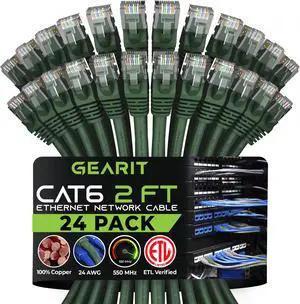 GearIT Cat 6 Ethernet Cable (24-Pack 2 Feet) Cat6 Network Patch, 10Gbps, RJ45, Snagless Cord, Gold-Plated Connectors, Internet for PC, TV, Tablet, Router, Printer, Servers, IT Data Center - Green