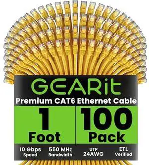 GEARit Cat 6 Ethernet Cable (100-Pack 1 Foot) Cat6 Network Patch, 10Gbps, RJ45, Snagless Cord, Gold-Plated Connectors, Internet for PC, TV, Tablet, Router, Printer, Servers, IT Data Center - Yellow