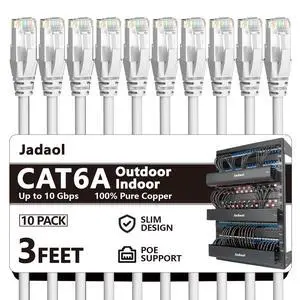 Cat6a Ethernet Cable 3 ft 10 Pack, Slim 10G 550MHz 28AWG Patch Cable, Snagless Pure Copper Network Cable, Flexible LAN Cable for Router, Modem, Switch, Patch Panel, Data Center, Gaming, White