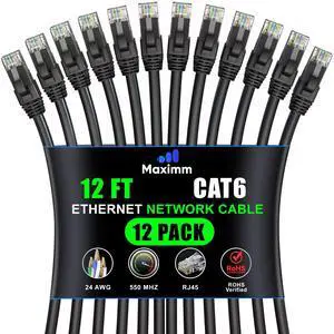 Maximm Cat 6 Ethernet Cable 12 Ft, (12-Pack) Cat6 Cable, LAN Cable, Internet Cable, Patch Cable and Network Cable - UTP (Black) 12 Feet ethernet Cord