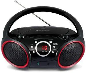 SBX030C Portable CD Player Boombox with AM/FM Stereo Radio, Aux Line-in, Headphone Jack, Top-Loading Disc Player, AC or Battery Powered, Foldable Handle (Black with Red Rims)