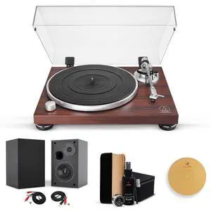 Audio-Technica ATATLPW50BTRW Automatic Turntable, Shelf Speaker & Cleaner Kit, Cork Platter, Bundle