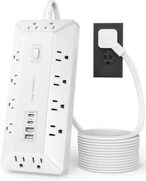 Surge Protector Power Strip with 10 Widely-Spaced Outlets & 6 USB(2USB C) Ports, 10ft Flat Plug Extension Cord Wall Mountable, Desktop Charging Stations for Home Office Bedroom Kitchen