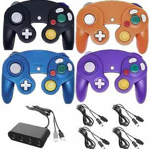 4 Pack Wired Gamecube Controllers with 4 Port USB Adapter and 4 Pcs Extension Cord Set for Game Cube, Switch, WII, Wii U Console, PC (Black Purple Orange Bule)