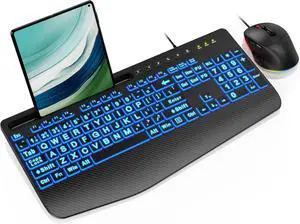 Wired Keyboard Mouse Combo - Large Print Backlit, Ergonomic Wrist Rest, 6 DPI RGB for PC/Windows - Ideal for Seniors, Students, Office and Home SABLUTE