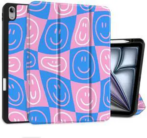 MEEgoodo Case for iPad Air 13 inch 2025 2024 (M3/M2), Tablet Cases with Trifold Stand + Pencil Holder + Auto Wake/Sleep + Soft TPU Back Cover, Smiling Faces & Checkered