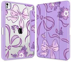 Mektron Case for M5/ M4 iPad Pro 11 inch 2025/2024 with Pencil Holder, Compatible Models: A3357/A3358/A3359/A2836/A2837/A3006, Shockproof Cover Clear Shell, Flowers-Bows-Purple