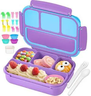 Bento Lunch Box for Kids Girls Boys, Toddler Kids Lunch Boxes for School, Lunch Containers for Adults with 4 Compartments, Sauce Container, Utensils, Food Picks and Muffin Cups, Purple