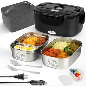 Electric Lunch Box for Adults - 1.5L Single/Double Layer Stainless Steel Food Warmer - 80W Fast PTC Heated Lunchbox, 12V/24V/110V Portable Food Heater for Car&Truck, Office, Camping, Travel(Black)