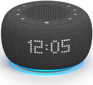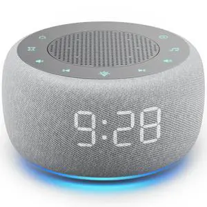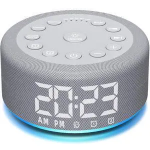 Features: To use the noise machine, follow these steps: 1. Plug in the device using the provided power cord. 2. To set the clock format, switch between 12-hour and 24-hour modes. 3. Set up to 1 alarm with a choice of 7 alarm tones and adjustable volume levels (32 levels). 4. Select from 21 soothing sounds, including 5 white noises, 3 fan sounds, 2 lullabies, and 11 natural sounds, and adjust the volume across 32 levels. 5. Choose from 8 different night light colors to create a soothing ambiance. 6. Set a sleep timer for automatic shutdown, ranging from 5 to 180 minutes.