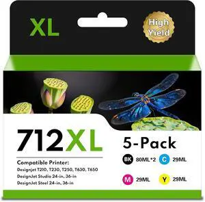 712XL 712 Ink Cartridges High Yield Replacement for HP 712XL Black and Color Combo Pack for DesignJet T230 T650 T630 T210 Studio Plotter Printer (5Pack, 80-ml 2Black, 29-ml Cyan/Magenta/Yellow)