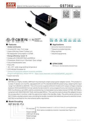 MEAN WELL GST36U05-P1J 21.5W AC-DC Reliable Green Industrial Adaptor GST36U 5V 4.3A